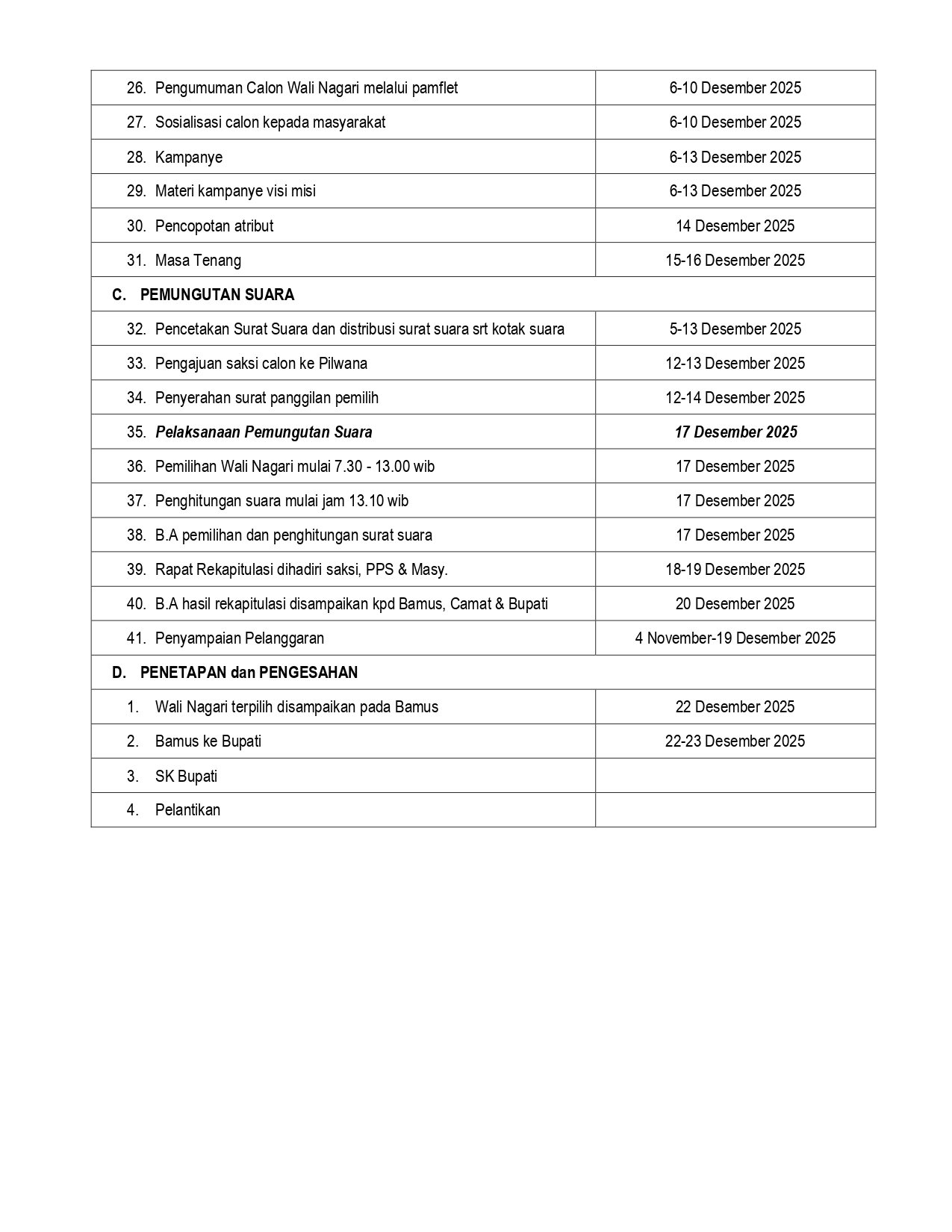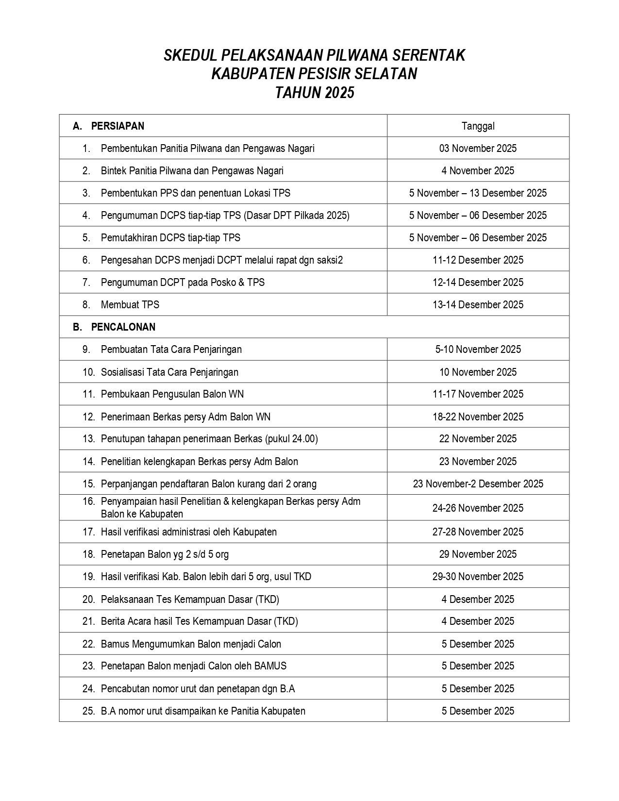 pada hari ini senin tanggal tiga bulan november tahun 2025 telah dilaksanakan tahapan awal dari proses pemilihan wali nagari dengan pembentukan panitia pilwana dan pengawas pilwana. dalam kesempatan tersebut di sepakati dan menjadi keputusan akhir untuk susunan panitia pilwana adalah sebagai berikut: